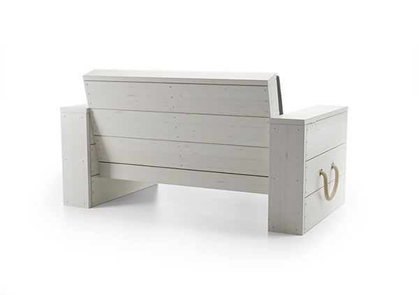Die 2er Lounge Bank besteht aus gehobelten Holzbohlen, nordischer starker Fichte. Sie ist lasiert und in lichtgrau oder weiß erhältlich. Die Trageschlaufen sind aus gedrehtem Polyhanfseil und die Seildurchlässe sind aus Edelstahl gebürstet. Die Armlehnen können zur Verstauung von Schutzhüllen o.ä. geöffnet werden. Die angegebenen Preise sind inklusive Polster.