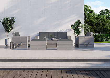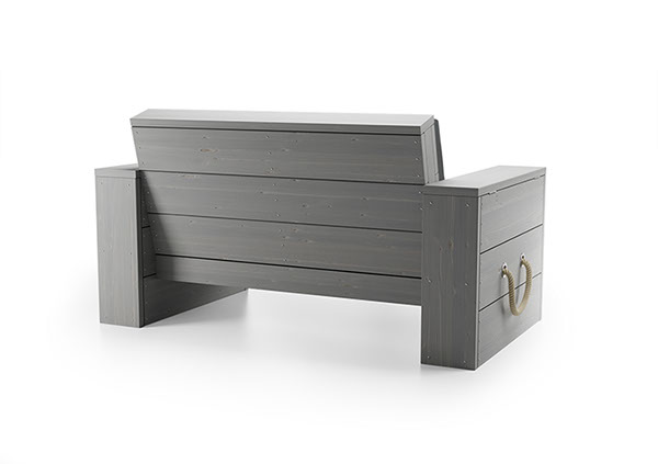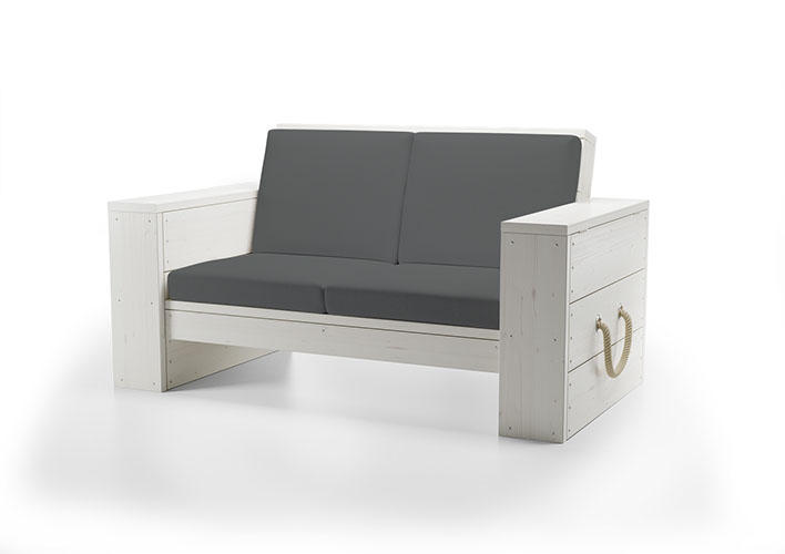 Die 2er Lounge Bank besteht aus gehobelten Holzbohlen, nordischer starker Fichte. Sie ist lasiert und in lichtgrau oder weiß erhältlich. Die Trageschlaufen sind aus gedrehtem Polyhanfseil und die Seildurchlässe sind aus Edelstahl gebürstet. Die Armlehnen können zur Verstauung von Schutzhüllen o.ä. geöffnet werden. Die angegebenen Preise sind inklusive Polster.