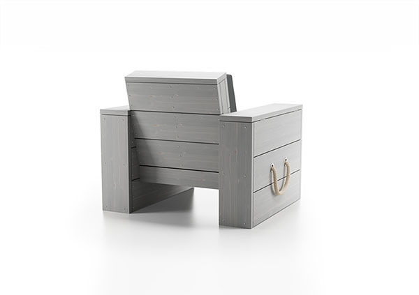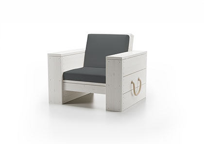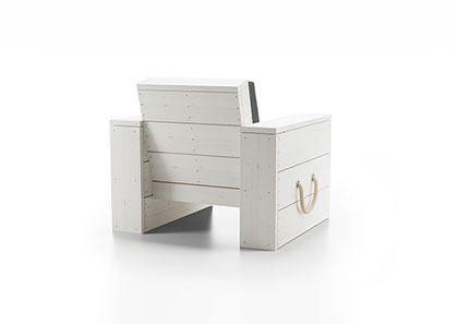 Der Lounge Sessel besteht aus gehobelten Holzbohlen, nordischer starker Fichte. Er ist lasiert und in lichtgrau oder weiß erhältlich. Die Trageschlaufen sind aus gedrehtem Polyhanfseil und die Seildurchlässe sind aus Edelstahl gebürstet. Die Armlehnen können zur Verstauung von Schutzhüllen o.ä. geöffnet werden. Die angegebenen Preise sind inklusive Polster.