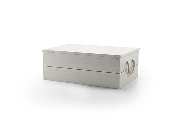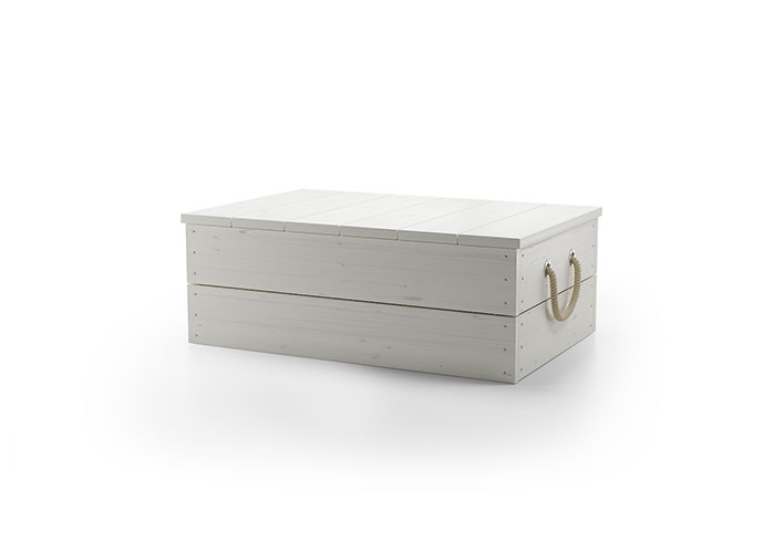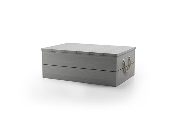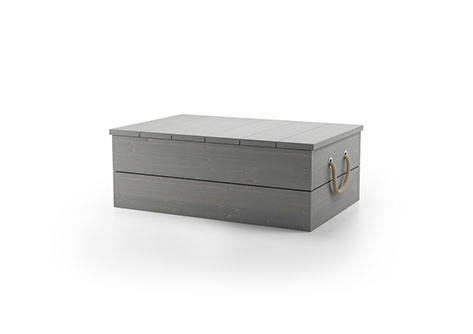 Der Lounge Tisch in der langen Variante besteht, wie auch die kleinere Ausführung, aus gehobelten Holzbohlen, nordischer starker Fichte. Er ist lasiert und in lichtgrau oder weiß erhältlich. Die Trageschlaufen sind aus gedrehtem Polyhanfseil und die Seildurchlässe sind aus Edelstahl gebürstet. Die Tischplatte kann zum Verstauen von Schutzhüllen o.ä. aufgeklappt werden.